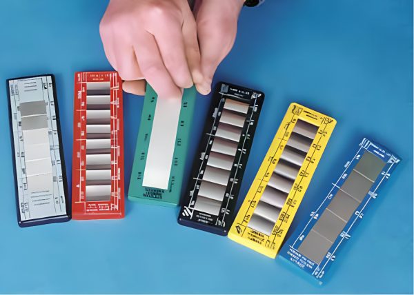 Comparison specimens are easy to use. Just run a fingernail over your work piece, and then over the specimens. Estimate its roughness by comparing with the scale of specimens.